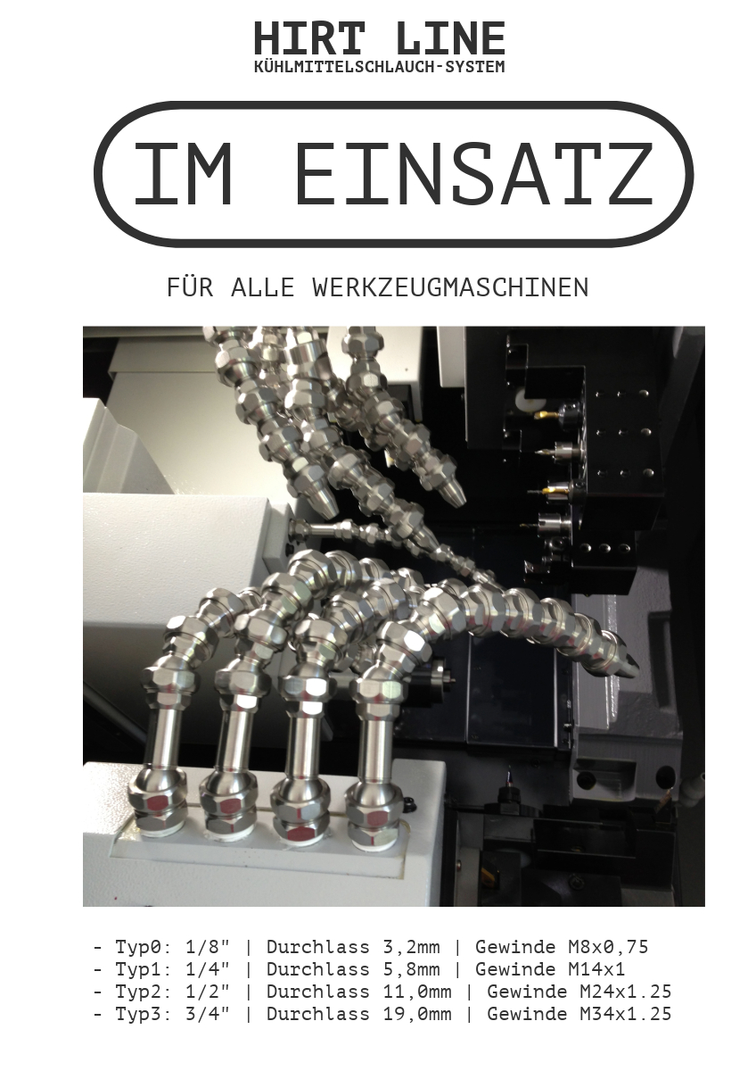 Das HirtLine Kühlmittelschlauchsystem aus Edelstahl erhöht die Werkzeugstandzeit durch bessere Kühlung und Stabilität und verbessert die Prozesssicherheit durch eine präzise und zuverlässige Kühlmittelführung. Dies führt zu einer gesteigerten Produktivität und einer effizienteren CNC-Bearbeitung.