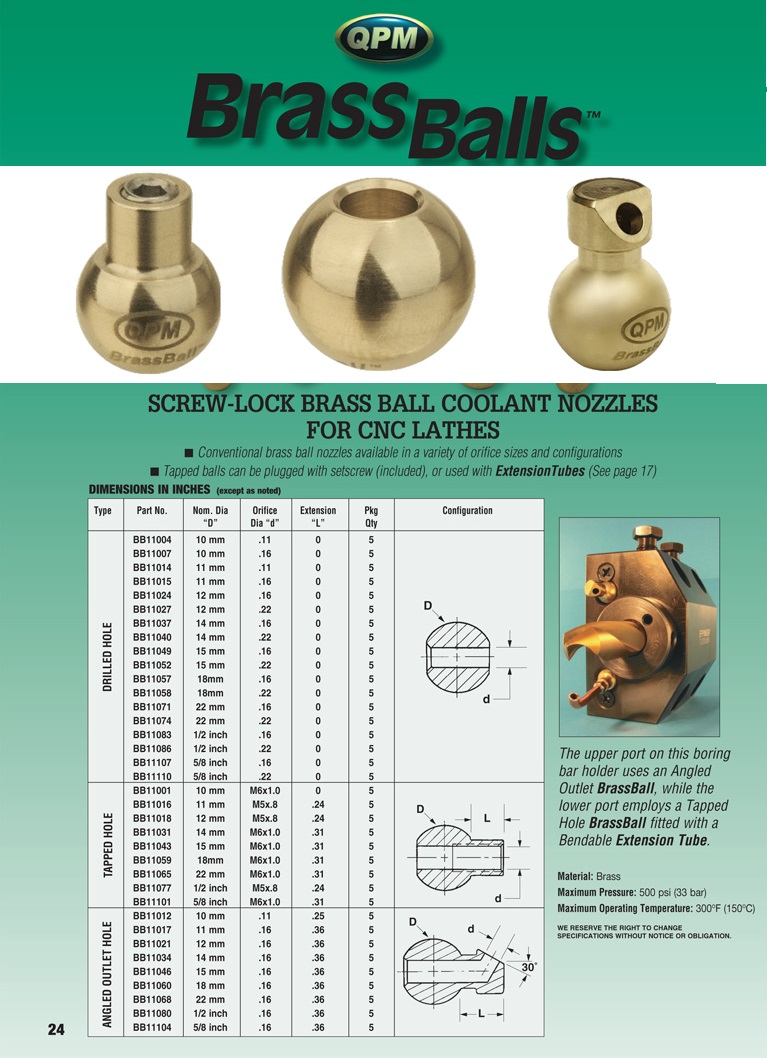 Die Brass Ball Kugeldüse Kühlmitteldüse ist individuell justierbar und verfügt über geraden, gewinkelten Auslass oder ein verschließbares Innengewinde , einem Grundkörper aus Messing, was ein einfaches Wechseln ermöglicht. Die Düsen können in verschiedenen Positionen fixiert werden. Wechselbare Spray Tips Düsenköpfe oder Extension Tubes Verlängerungsrohre aus Messing oder Kupfer sind in vielen Varianten und Durchmessern erhältlich.