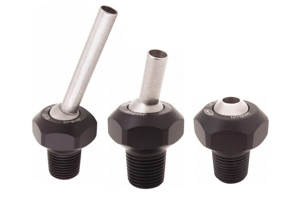 Die Einschraub-Kühlmitteldüse ist individuell justierbar und verfügt über ein Kugelgelenk aus rostfreiem Stahl, was ein einfaches Wechseln ermöglicht. Die Düsen können in verschiedenen Positionen fixiert werden, mit einem Verstellbereich von ±35°.