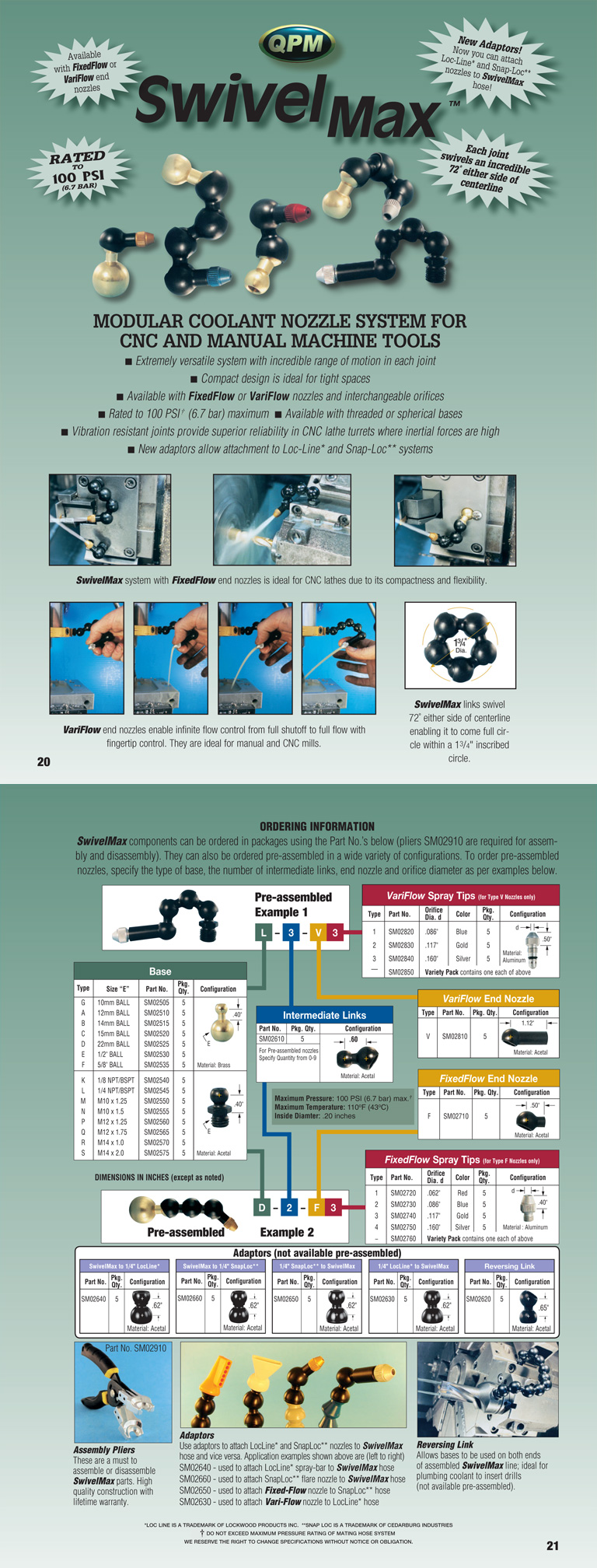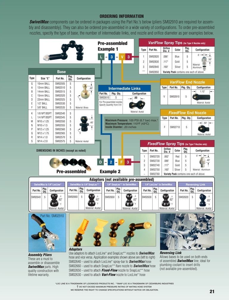 SwivelMax-Komponenten können in Paketen unter Verwendung der folgenden Teilenummern bestellt werden (Zangen SM02910 sind für Montage und Demontage erforderlich). Sie können auch vormontiert in einer Vielzahl von Konfigurationen bestellt werden. Um vormontierte Düsen zu bestellen, geben Sie den Typ der Basis, die Anzahl der Zwischenverbindungen, die Enddüse und den Öffnungsdurchmesser gemäß den folgenden Beispielen an.