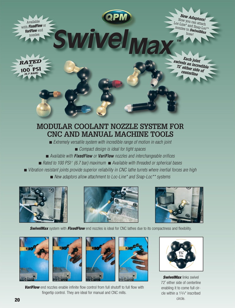 - VariFlow- Enddüsen ermöglichen eine variable Durchflusssteuerung von vollständiger Abschaltung bis zum vollen Durchfluss mit Fingerspitzenkontrolle. Sie sind ideal für manuelle und CNC-Fräsmaschinen.