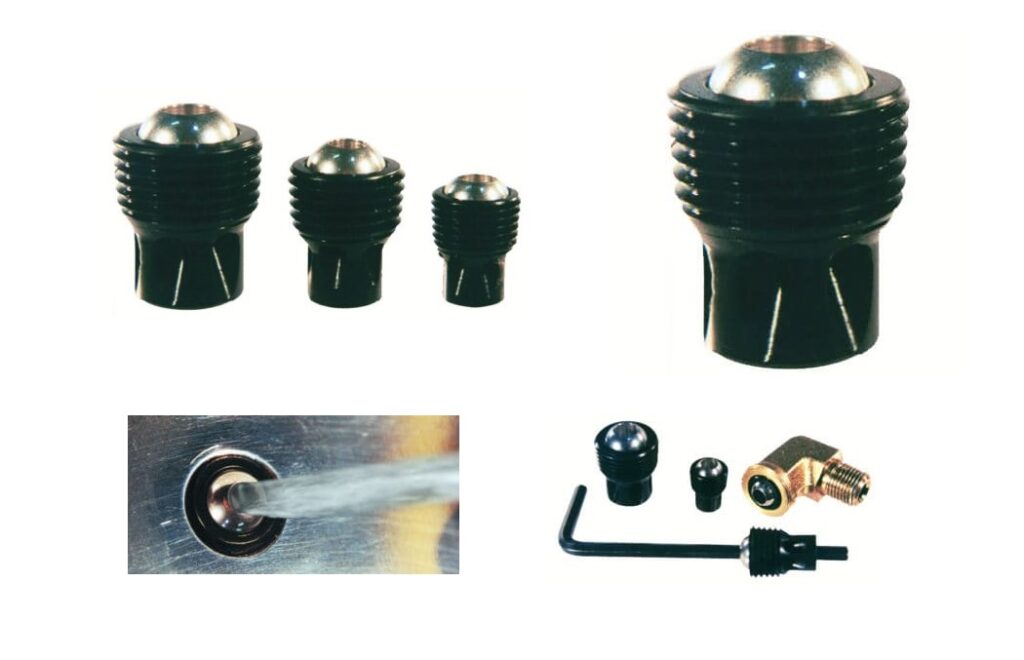 Die Einschraub-Kühlmitteldüse ist individuell justierbar und verfügt über ein Kugelgelenk aus rostfreiem Stahl, was ein einfaches Wechseln ermöglicht. Die Düsen können in verschiedenen Positionen fixiert werden, mit einem Verstellbereich von ±35°.